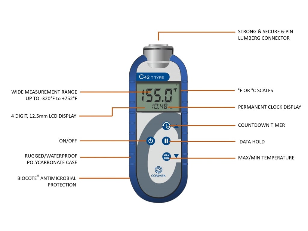 Coupled with the C42F Type T Food Thermometer it will provide an accuracy of ±0.9°F (±0.5°C) from 32°F to 158°F (0°C to 70°C).