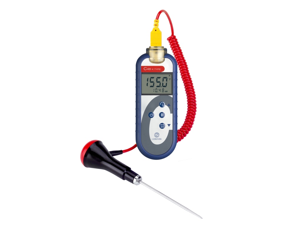 The C48 Food Thermometer is reliable and accurate for temperature measurement in all food environments. Housed in a robust case with built-in protective rubber boot, designed for use with a wide range of Comark probes with sub-miniature connector. The features of this Type K Food Thermometer include a permanent clock and countdown timer within the display – with selectable alarms – to allow probe insertion times to be monitored.