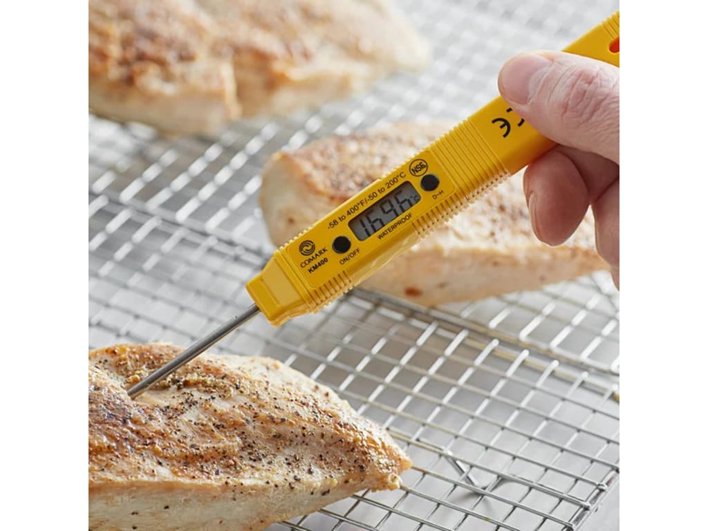 The KM400 Waterproof Thermometer is a low-cost, digital pen-style thermometer with a narrow tip for fast reaction times perfect for busy industrial kitchens. Designed foodservice kitchens, the pen-style KM400 Waterproof Thermometer is yellow, a recognizable color. The KM400 Waterproof Thermometer contains a 1.5mm thin tip for quick response, as well as a hold feature that allows the user to fix the reading on the screen temporarily while taking measurement.