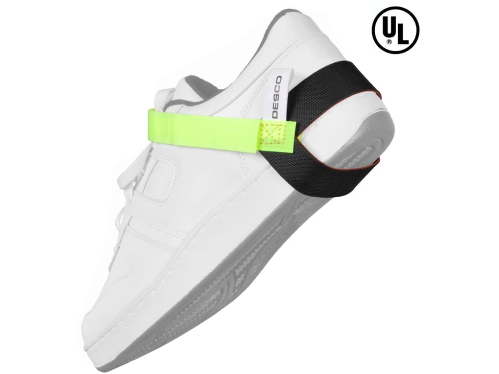 This DESCO economy heel grounder with high-visibility lime green strap is adjustable and has a 1 megohm resistor. It is designed for use with most standard shoes and can be easily adjusted.