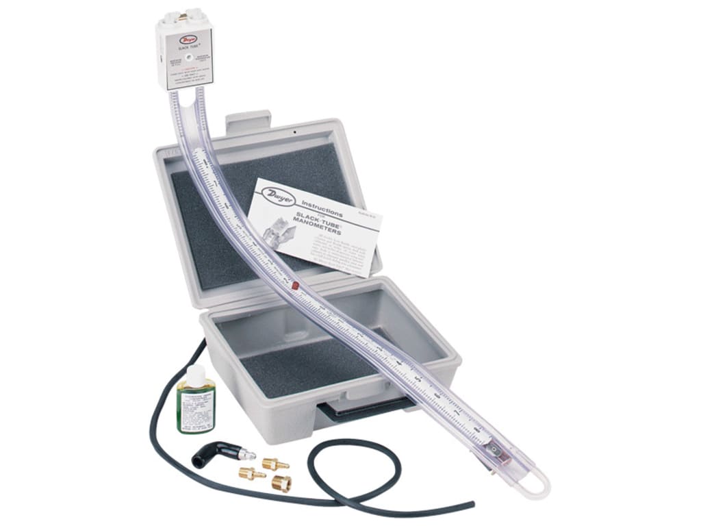 Dwyer Slack Tube Manometers cover a wide range of pressure readings from 4-0-4 inches up to 60-0-60 inches. Use them in determining velocity and static pressures, for leakage, fan and blower tests, calibrating control devices, checking gas pressure and many other applications.