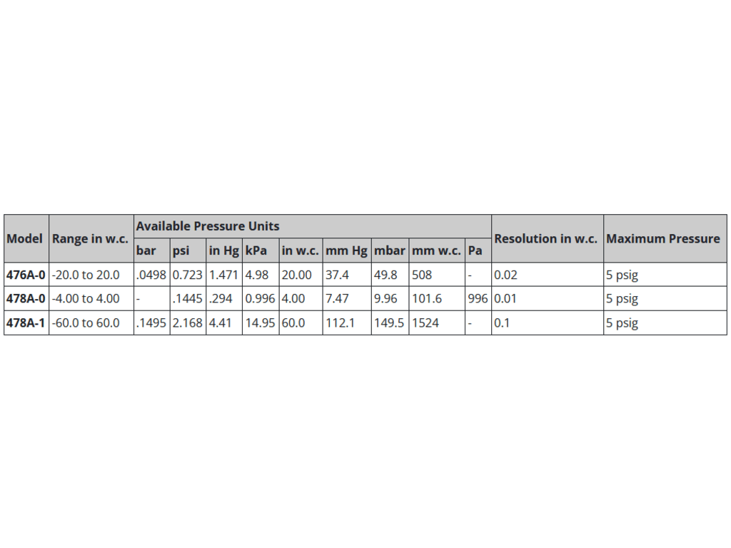 This product series covers several pressure ranges. There is also a single pressure model available, the 476A. The chart below provides an overview of each.