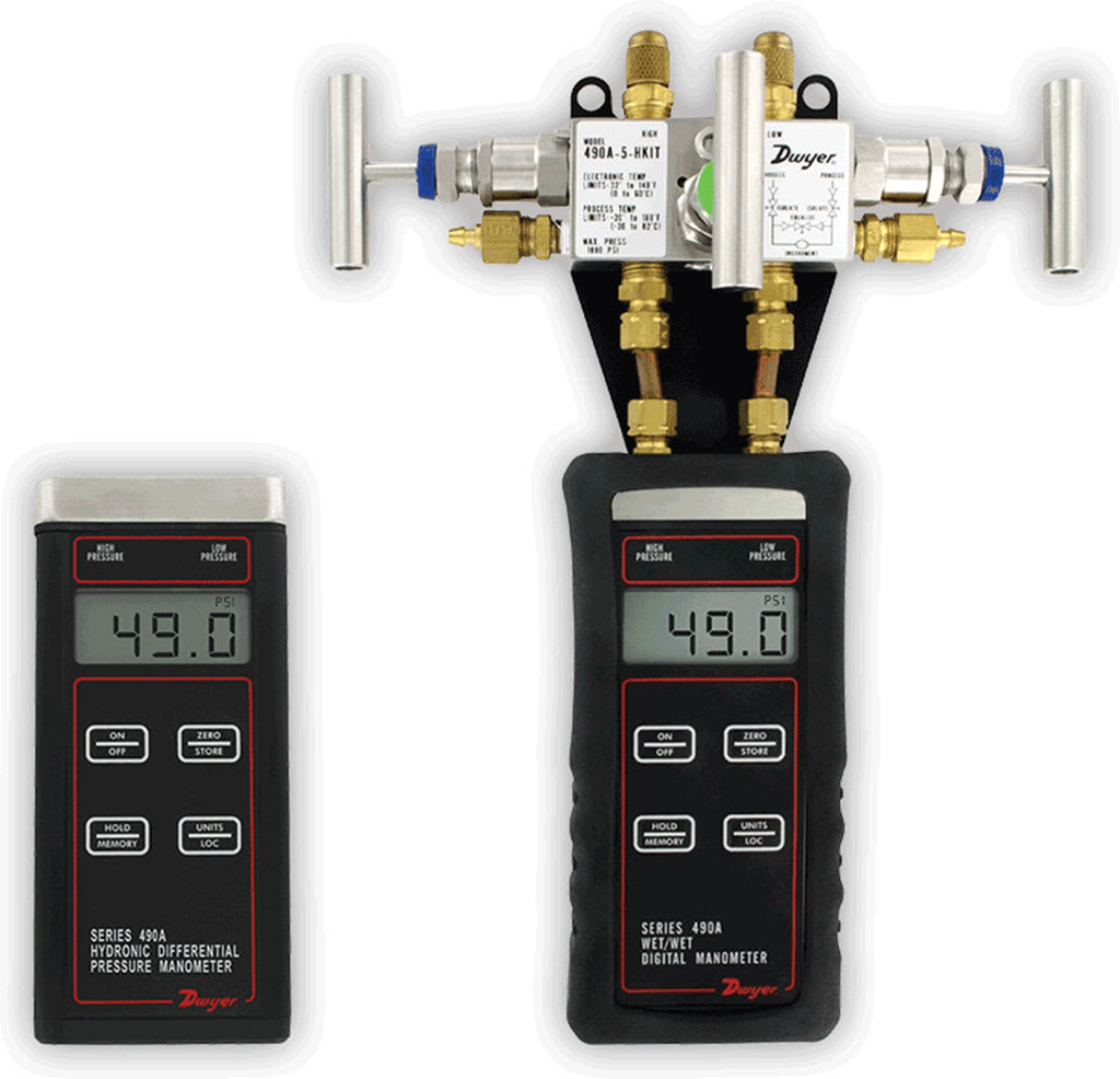 The SERIES 490A-HKIT features the 490A Hydronic Differential Pressure Manometerwith all the necessary attachments and accessories to meet all your balancing, measuring,and pressure needs. The manometer featured in this kit is a versatile, handheld, batteryoperated manometer available in several ranges for positive or positive differential pressuremeasurement and can tolerate most liquid media compatible with 316LSS. A new featureadded to the Series 490A is a field adjustable damping, which allows the user to choosethe level of display averaging rate corresponding to the fluctuation level common in manyapplications.