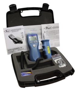 The TAC3K Kit comes with a tachometer, plastic case, remote contact assembly, concave and convex contact tips, 3.9 in. (10 cm) circumference contact wheel, NIST certification, and 5 ft (1.5 m) of reflective tape. Optional TAC3-91 Remote Optical Sensor allows this unit to measure rps, rpm, or rph in hard to reach locations.
