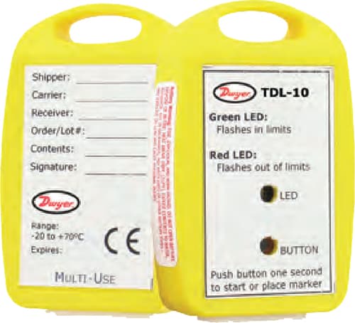 The Model TDL-10 is a compact and portable data logger used for recording temperature of goods in-transit. It records a wide temperature range from -4 to 158°F (-20 to 70°C). The data logger features programmable high and low alarms that are indicated with green and red LEDs on the face of the logger. The label on the back of the logger allows for important shipping information to be recorded. The TDL-10 can record over 8,000 measurements, and the easy to use TDL-SC software makes retrieving data simple. The TDL-10 can easily be started and stopped from a PC, delayed to start up to thirty days in advance, or begin to start by a push of a button.