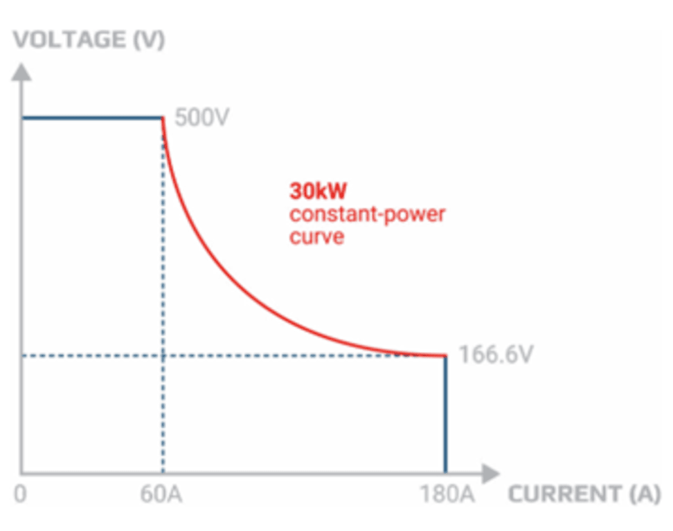 The output of the power supply PS 10000 with a DC voltage of 0 - 60 V up to 0 - 2000 V allows currents of 0 - 6 A up to 0 - 1000 A. The flexible output stages (auto-ranging) provide the user with a wide voltage, current, and power range and hence a wider field of working than traditional power supplies.
