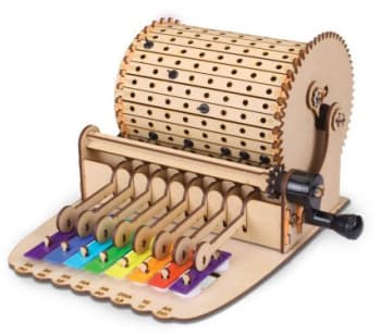 Build a mechanical xylophone! This kit is music to every ear - kids can actually compose their own tunes, too! Build the music machine, select a music sheet, and insert the pegs into the corresponding slots of the machine’s barrel. Then, rotate the handle of the machine to watch the mallets play your tune. Learn about music notations and compose your own tunes by placing the pegs in different slots. This kit also contains instructions for composing two simple tunes - explore the magical, wonderful world of music! Decorate with your own paints and markers and make it unique!