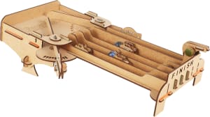 The most amazing marble-based, Do-It-Yourself racing game! Racing meets basic physics concepts, such as gravity, momentum, and angle of deflection. After assembly, race your cars, avoid the bombs, and be first to reach the finish line. Four different cars! Each player chooses 2 cars and 2 lanes. Just flick the marbles and land them in your lane to push your cars ahead... Be careful, if your car lands on a bomb, you need to go back to start! Accurate control is provided with cleverly designed bounce plates helping you to target marbles into the racing lanes. This dynamic game has 2 different play modes that change the speed. Learn the physical aspects of collisions and momentum while enjoying the thrill of racing.