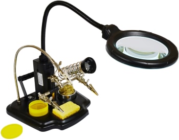 The multi-purpose tool offers an excellent all-round solution, ideal for working on small PCBs, components, soldering etc. The magnifying lamp with an integrated 3rd hand is intended for illumination work areas and it is equipped with a magnifying glass. This device also comes with soldering iron stand, alligator clips, soldering wire spool holder, sponge, rosin, as well as cleaning ball, to help with soldering. It can be powered either by 4 AA batteries (not supplied) or external power adaptor (not supplied).