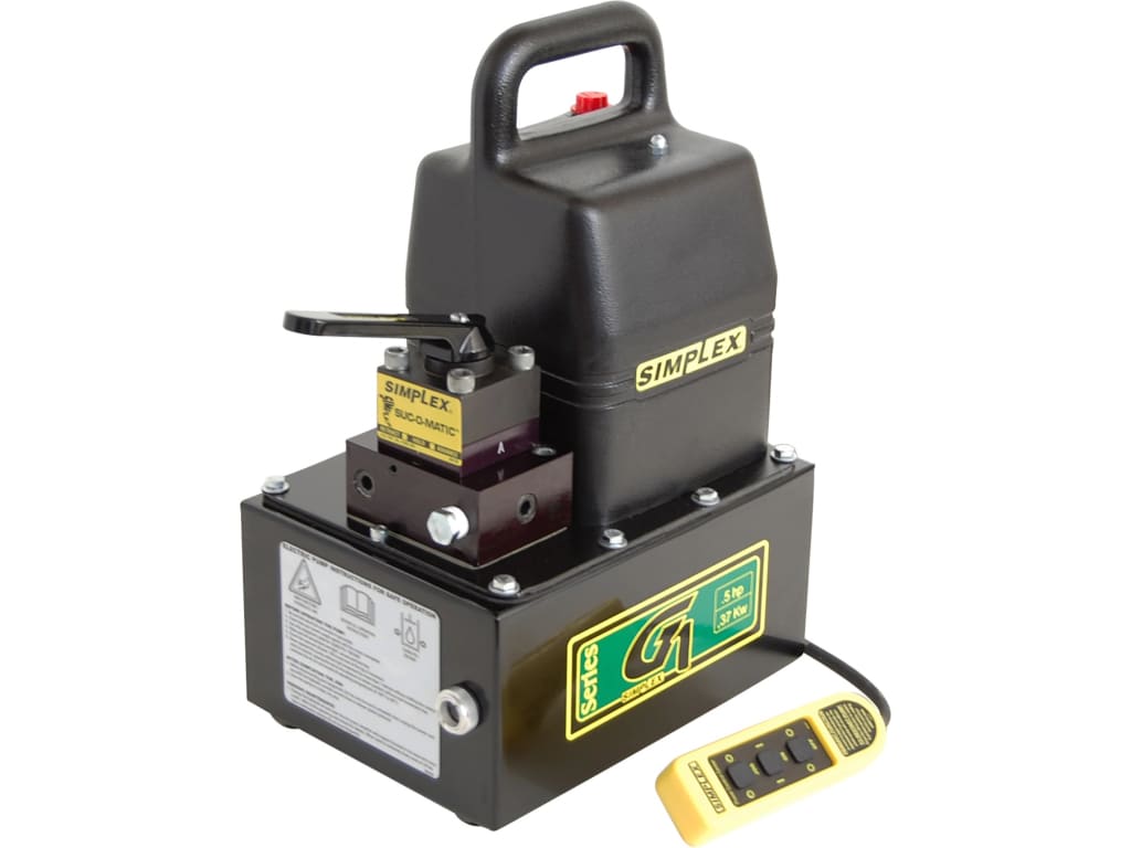 The Enerpac G1201 is an electric hydraulic pump with a dump valve featuring 19 cu.in./min oil flow at 10,000 psi, 1 gallon usable oil, and 230V motor voltage. The intermittent 0.5 hp (0.37 kw) power pump is best suited for powering small to medium-sized tools or cylinders. It's very lightweight, portable and works well for crimping, cutting, pressing, punching, and bending applications. It's powered by a 230V-60HZ, 0.5 hp (0.37 kw) universal motor (14,640 rpm). The low startup voltage draws 5 amps at full load. Its two-speed pump operation provides fast tool performance. External adjustable relief is standard on all models.