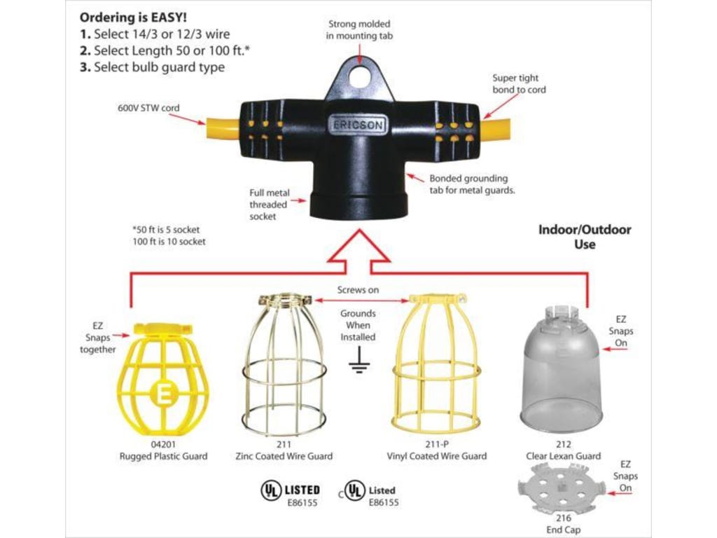 Ericson 143100STWY-1W is a 100ft light 14/3 stringlight set with wire guards. Ericson Code Compliant Listed 3 Wire Commercial Duty Stringlight Sets. It is a built-in hanger for easy installation with messenger cable or hooks and construction lighting come standard with Ericson’s molded plugs and connectors