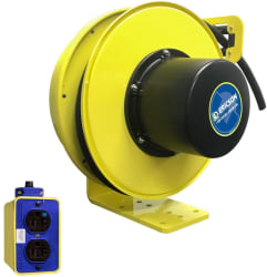 REEL INDUSTRIAL GRADE, RETRACTABLE 50 FT OF 12/4 SOW CABLE W/ OUTLET BOX (6000) W/ 2 NEMA 5-20R DUPLEXES, PRIMARY FEEDER = BLUNT CABLE END @ 1-2 FT