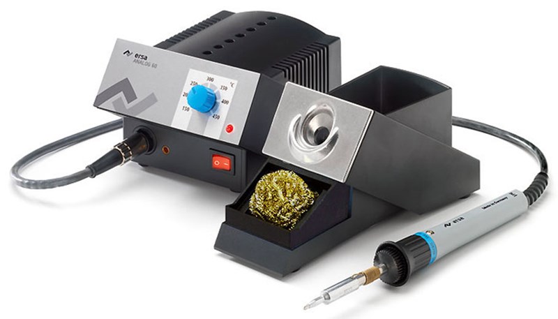 The electronically temperature-controlled ANALOG 60 soldering station is the basic model of the Ersa soldering station series. It has the tried and proven Ersa RESISTRONIC temperature control technology, with the ceramic PTC heating element serving as the temperature sensor. The high initial power enables fast heat up.