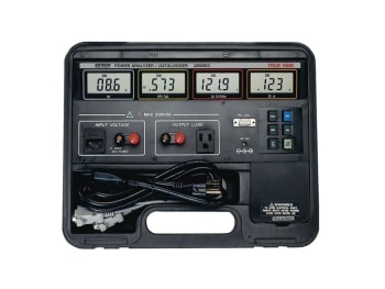 The 380803 is a True RMS power analyzer and data logger. Appliance Tester/Power Analyzer simultaneously displays the Wattage, Power Factor or VA, Voltage or frequency (Hz), and Current (Amps) of the device or appliance tested. The built-in data logger can store up to 1,012 readings or you can save data directly to your PC using the built-in RS-232 port and included software. Additional features include Max Hold, Data Hold, and overload protection. Battery or AC Adaptor Operation provides line isolation. Comes complete with 8 AA batteries, software, cable, power cord, AC Adaptor, and case.