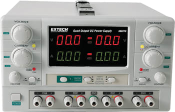 382270 is a Quad Output DC Power Supply that has two 0 to 30V/0 to 5A outputs plus two fixed auxiliary outputs of 3 to 6.5V/3A and 15V/1A. The two 30V outputs can be combined in parallel for 10A or in series for 60V. Comes complete with 4 pairs of test leads (banana plug to an alligator clip) and an AC cord.