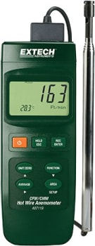 The 407119 Heavy Duty CFM Hot Wire Thermo--Anemometer uses a telescoping probe (extends up to 3 ft) which is ideal for use in ducts and ventilating systems. It can accurately measure Air Flow (CFM/CMM), Air Velocity and Temperature. Air Flow can be displayed as an instantaneous value or up to a 20 point average. Additional functions include Data Hold, Min/Max, and Auto power off. Comes complete with telescoping probe with 5.5ft cable, and 4 x AA batteries.