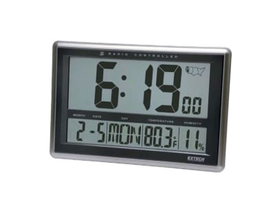 Receives Time Code from NIST Radio Station WWVB (North American region) and automatically adjusts year, date, day, hour, minute, second, and DST. A large LCD displays time, RH percent, temperature, year, month, date, and day. The super large 4.3-inch (109mm) digit clock display can be viewed from a distance. A signal indicator displays radio signal strength in 3 levels to indicate successful synchronization. The clock automatically adjusts for daylight savings time (DST). The Hygro-Thermometer measures temperature from 23 to 122 degrees F (-5 to 50 degrees C) and Humidity from 20 to 90 percent RH with accuracies of ±2 degrees F, ±1 degrees C and ±6 percent RH. Additional features include: Alarm Clock function, switchable degrees F/ degrees C, and a built-in stand for desktop use (clock may also be wall mounted).