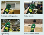 Extech EN300 is Rugged 5-in-1 Environmental Meter that measures Humidity, Temperature, Air Velocity, Light, and Sound. This professional measuring instrument provides the following functions: