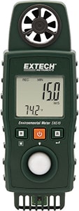 Convenient 10-in-1 Environmental Meter measuring Air Velocity, Air Flow, Air Temperature, Type K Temperature, Heat Index, Humidity, Wet Bulb, Dew Point, Windchill, and Light Level. Includes built-in low friction ball bearing mini vane wheel, a precision photodiode with cosine and color correction filter, and a capacitive humidity sensor for high accuracy. The Type K input accepts standard Type K Thermocouple probes to measure surface temperature up to 2372°F (1300°C). Features large dual LCD with backlighting, Data Hold, and Min/Max function.