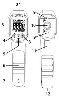 • Dual laser pointer identifies target area between the two points (~1"/25mm diameter of measured area)