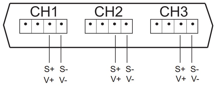 Mounting and Wiring The SD750 can be placed on a tabletop using the supplied tilt stand, it can be wall mounted using the rear mounting access holes, or it can be laid flat on a desktop or other surface. Up to three 4‐20mADC pressure transducers (two‐wire) can be connected to the bottom of the SD750 as shown in the diagram below. Wiring for 2‐wire transmitters must be configured exactly as shown in the diagram. Only the two terminals on the right for each channel group are to be used. The two terminals on the left for each channel group are unused. Signal positive (S+) and Power positive (V+) are connected to the same terminal as shown in the diagram below. Signal negative (S-) and Power negative (V‐) are connected to the same terminal as shown below.