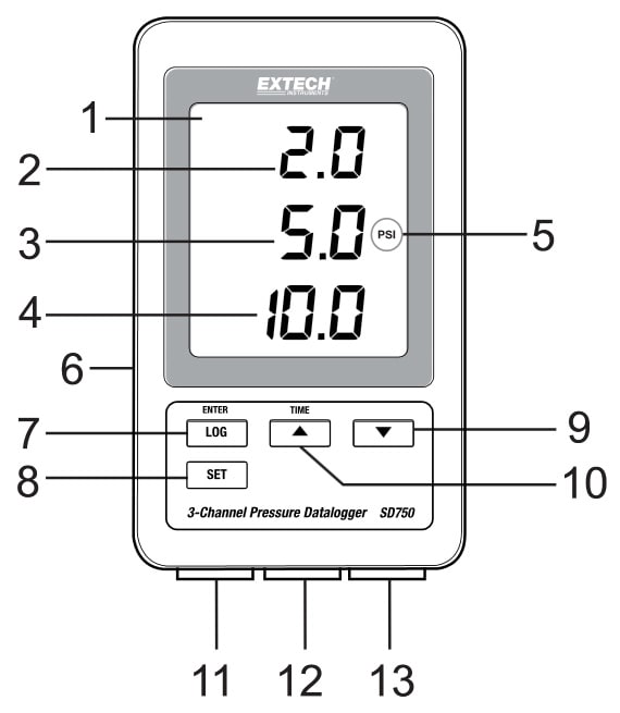 Records data to SD card in Excel format Pressure Datalogger displays and stores pressure management data over time. Using an SD card, readings are easily stored and are able to be seen on a computer in Excel format. The Extech SD750 measures and displays three different channels at once, using one meter instead of three. The Extech SD-750 is useful for applications like pressure measurements from hydraulic, pneumatic, air compressor, and gas systems, and more. This tool has three optional transducers with different ranges that are compatible with it, but are sold separately.