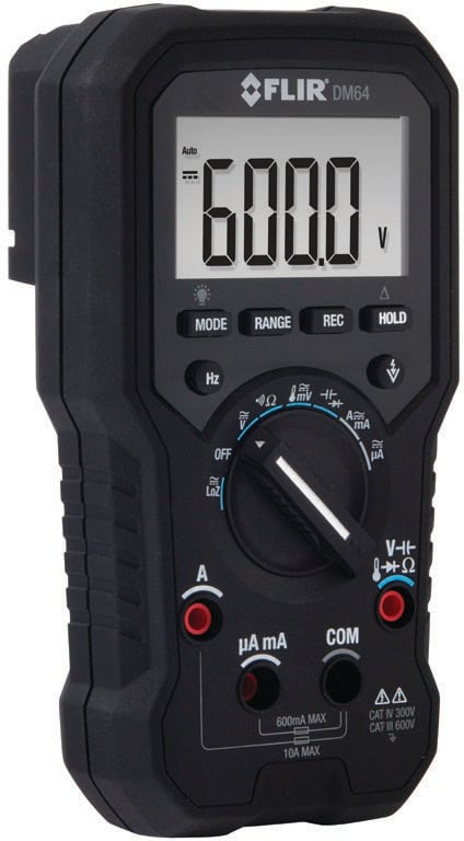 The FLIR DM64 is the only multimeter HVAC technicians need, providing an unmatched feature set and highquality measurements at an affordable price. This digital multimeter is easy to use and has been built to last, offering long term stability and robust build quality for field use. The DM64 is the right choice for professionals installing, inspecting and maintaining HVAC systems. The FLIR DM64 is the right choice for professionals who install, inspect, and maintain HVAC systems. It includes microamp measurement to test flame sensors, LoZ mode, measures capacitance and frequency, and features a Type K thermocouple input for temperature measurement. It is easy to use and built to last, offering long-term stability and quality making it ideal for field use.
