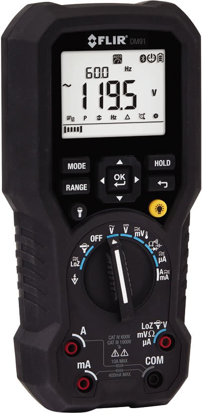 The FLIR DM90 and DM91 are affordable, safe, and reliable digital multimeters for a wide range of electrical and electronic system applications. With durable design, intuitive user interfaces, and comprehensive features covering high and low voltage applications, the DM90 and DM91 are uniquely positioned to help you trouble - shoot electrical, electronic and HVAC/R systems. The DM91 is also enhanced with Bluetooth® technology, so you can connect via METERLiNK® to FLIR infrared cameras, or to mobile devices running FLIR Tools TM or the FLIR InSite workflow management system.