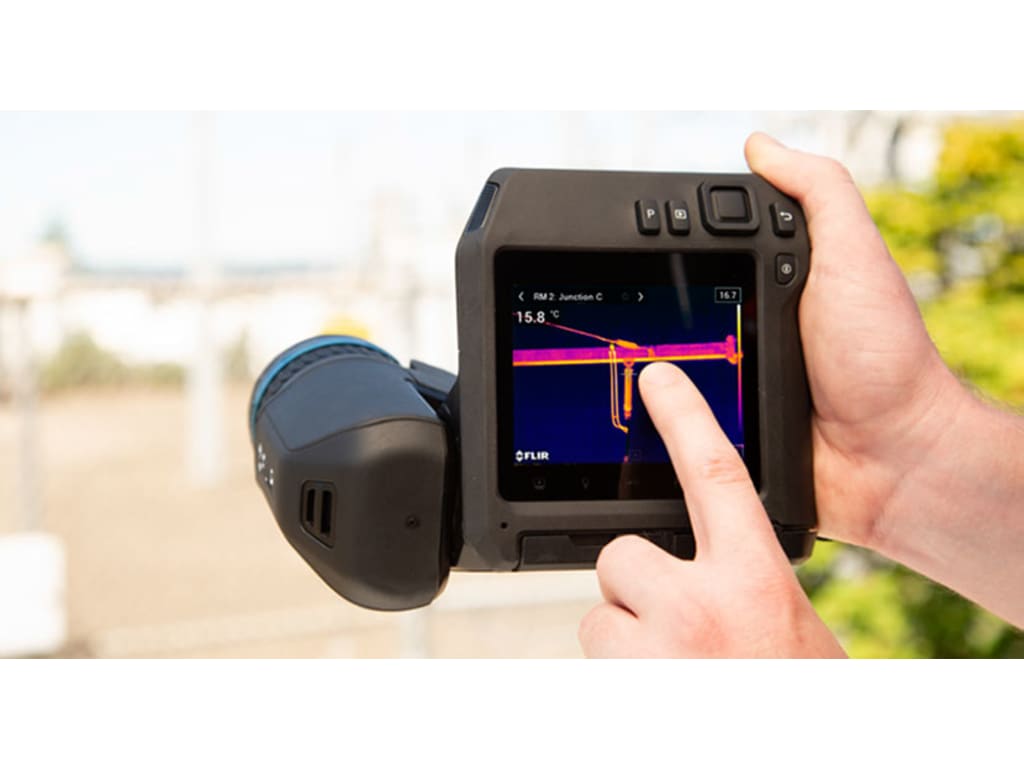 Diagnose potential faults in industrial, electrical, and mechanical systems with a T500-Series camera. These portable, ergonomic thermal cameras offer advanced features like 1-Touch Level/Span and continuous laser-assisted autofocus, making them the perfect non-contact diagnostic tools for condition monitoring. Streamline electrical/mechanical surveys, troubleshooting, and repairs with Inspection Route* mode. Run pre-planned routes created in FLIR Thermal Studio Pro† to record temperature data and imagery in a logical sequence for more efficient troubleshooting and repair scheduling, then upload images directly to the FLIR Ignite‡ cloud for secure storage, sharing, and importing into Thermal Studio.