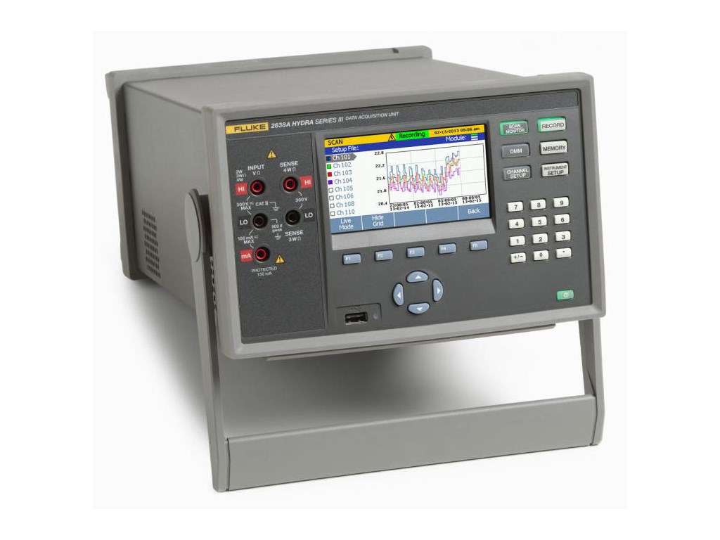 The Hydra Series III is based on a 6.5 digit (22-bit) precision digital multimeter measurement engine with exceptional measurement quality and resolution—so when you are not using your Hydra to collect multi-channel data, you can use it as a precision digital multimeter. Front-panel DMM-style input jacks and dedicated DMM menu selections enable you to measure dc voltage, dc resistance, ac voltage, ac resistance, Ohms, frequency, and temperature (thermocouples, RTDs and thermistors). Record DMM measurements to a separate DMM data file for later viewing. The 2638A also displays measurement statistics and graphs measurements right on the main display.