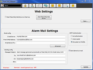 Alarm pages - The Fluke DAQ alarm page gives the operator a full page view of historical and present alarm conditions. The operator has full control over alarm acknowledgement function and can select filters for viewing specific channel alarm history by channel or date range. Alarm conditions may also be emailed to users for immediate notification of system status.