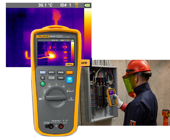 Thermal imaging multimeters are a first-line troubleshooting tool for electrical equipment that can check hot spots on high-voltage equipment and transformers, detect heating of fuses, wires, insulators, connectors, splices, and switches. Scanning with the 279 FC's thermal imager reveals many electrical issues rapidly and from a safe distance. By combining two tools into one, the thermal multimeter lightens the load and increases productivity.