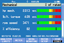 The NEMA derating screen is updated as the load and the electrical conditions change, and each new measurement is plotted on the tolerance graph as a “+”. In this example we can see that motor is within tolerance but is close to the service factor. This indicates that there may be a need for power quality mitigation, motor main - tenance or some other performance improving adjustment. By frequently performing these tests over time, known benchmarks and performance trends can be created, enabling informed maintenance investment decisions