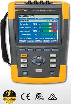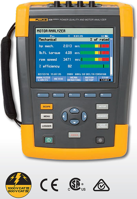 The ideal portable motor analysis test tool, the 438-II can help locate, predict, prevent, and troubleshoot power quality problems in three-phase and single-phase power distribution systems, while giving technicians the mechanical and electrical information they need to effectively evaluate motor performance.