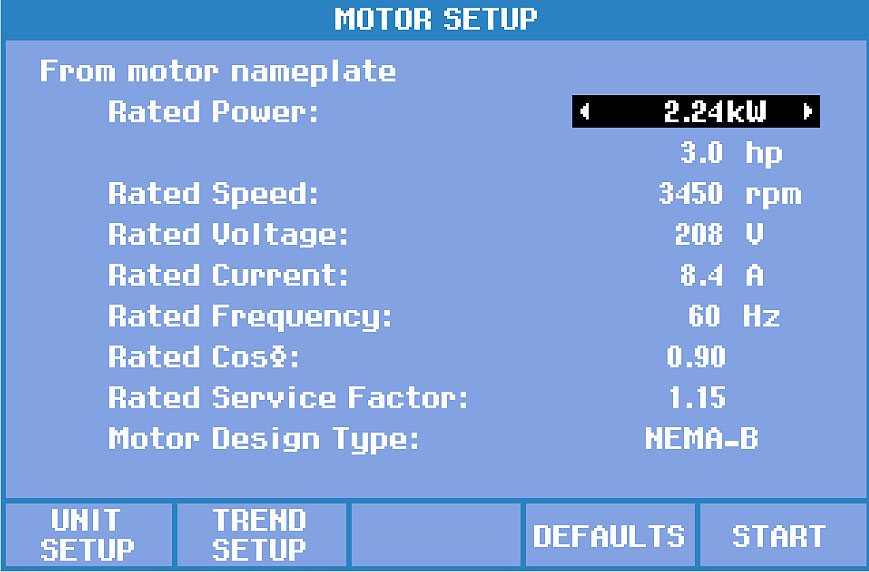 Input details of the motor from the rating plate including rated power, rated speed and motor type from either NEMA or IEC classifications.