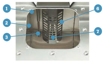 1. Tank - The stainless steel tank contains the bath fluid. 2. Bath Fluid - Temperature sensors are inserted into the bath fluid for calibration. 3. Control Sensor - A precision platinum resistance thermometer (PRT) control sensor measures and controls the temperature of the bath fluid. 4. Stir Motor Cover - Protects the stir motor. 5. Stir Motor (under the stir motor cover) - Drives the propeller that circulates the fluid to produce a uniform temperature. 6. Stir Guard - Separates the working area of the tank from the stir propeller. MIN and MAX marks show the correct fill levels.