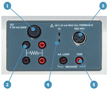 1. Current Fuse - Protects the Process Input Module and connected devices from accidental short circuit. 2. RTD Terminals - A test RTD connects to these terminals. The graphic on the panel shows the circuit diagram for a four-wire RTD. 3. Reference PRT connector - A reference probe plugs into this socket. Recommended Fluke Reference PRTs are models 5615-9-A and 5626-12-A. Other Fluke Reference PRTs with Type A INFO-CON termination are also compatible. 4. Thermocouple Input - A connector for a miniature thermocouple. 5. Transmitter Terminals - A 4-20 mA transmitter connects to the two transmitter terminals labelled mA LOOP and COM.