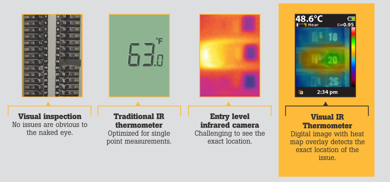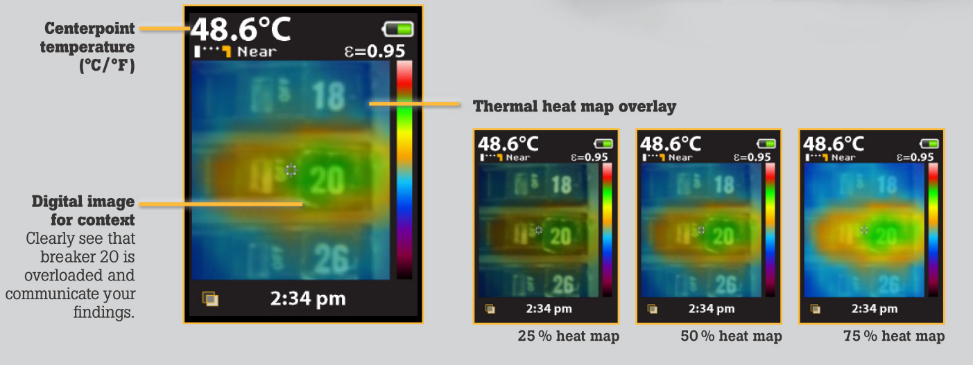 Every Fluke Visual IR Thermometer has a built-in digital camera with a thermal heat map overlay to instantly identify the exact location of the problem.