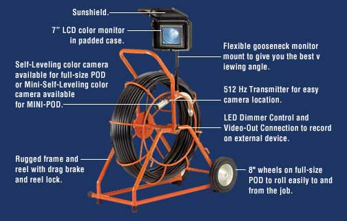The full size Gen-Eye POD features a self-leveling camera and 200 ft. of Gel-Rod® for trouble-shooting 3” to 10” drain lines. The big capacity MINI-POD carries 125 ft. or 175 ft. of push-rod and color mini-camera for inspecting 2” to 4” drain lines. The tough steel frame can be operated vertically or horizontally, so you can handle nearly any application.