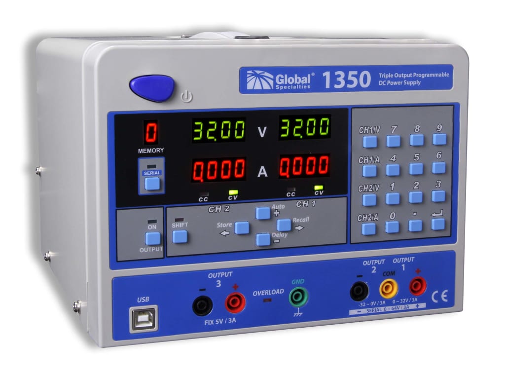 The 1350 features programmable control via a USB interface and microprocessor-controlled circuits. The voltage and current are controlled by a 12-bit D/A converter with resolutions as high as 10 mV and 1 mA respectively. The protections against over-voltage and current are completely regulated by the software producing a safe and reliable instrument.