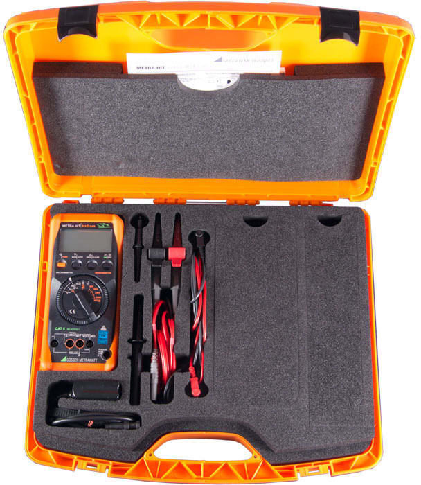 • Includes METRAHIT H+E multimeter , hybrid test case kit, test probes, protective rubber cover with carry strap, (3) AA rechargeable batteries, NA Hit 27 power adapter, Set of kelvin probes, hybrid-diagnostic kit, manuals, DAkkS calibration