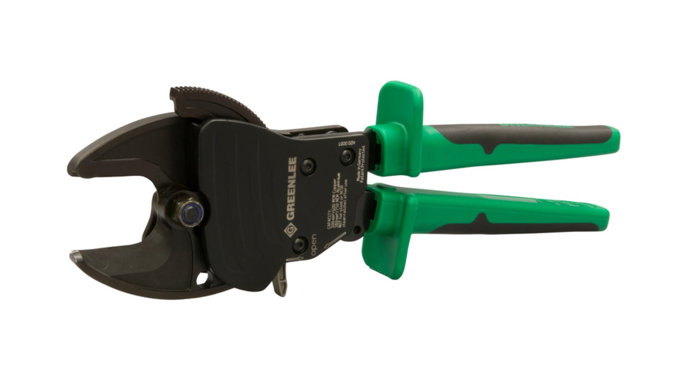 The Greenlee 45208G is an open-jaw ratcheting cable cutter that enables simple, one-hand operation for confined work areas. The two-step ratchet mechanism results in fewer strokes per cycle. It is ideal for soft metal applications and has a cutting range of 600MCM Copper, 750MCM Aluminum.