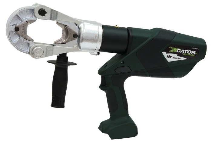 The Greenlee EK1550FLX fifteen ton, high-speed crimping tools are hand-held, self-contained tools intended to crimp aluminum and copper connectors onto electrical cable. These tools have a retraction stop feature which allows the operator to stop the retraction motion of the ram to shorten cycle time. The EK1550FLX also contains Bluetooth connectivity, which is enabled through the Gator Eye app.