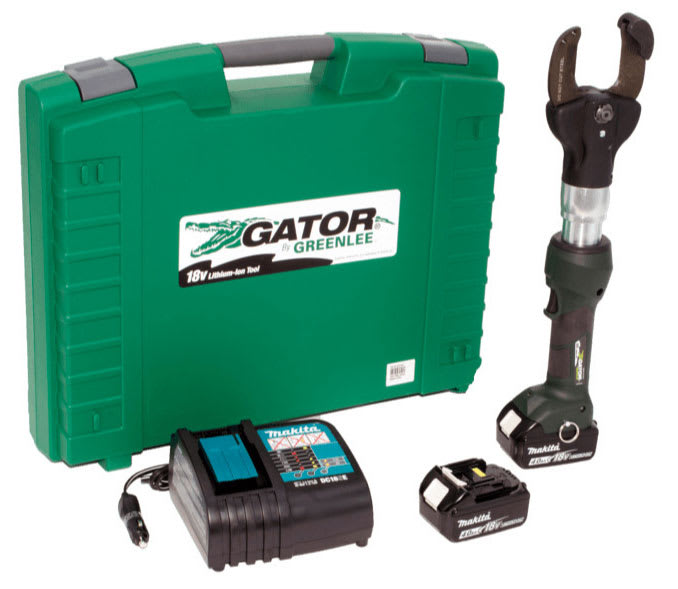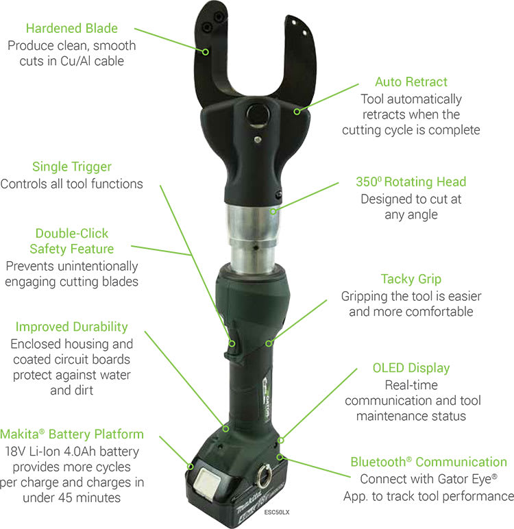 The Greenlee ESG50LX are pistol style cable cutters. Featuring a 50mm jaw opening, the ESG50LX are designed to cut copper and aluminum cable up to 2000 kcmil in thickness. The ESG50LX is easy to use, with one trigger controlling all tool functions. The cutting head can rotate 350 degrees, and the tool automatically retracts when the cutting cycle is complete. An over molded tacky grip area makes gripping the tool easier and more comfortable, while an LED work light illuminates dark areas. To view the Greenlee cutting tool selection guide, please click here.