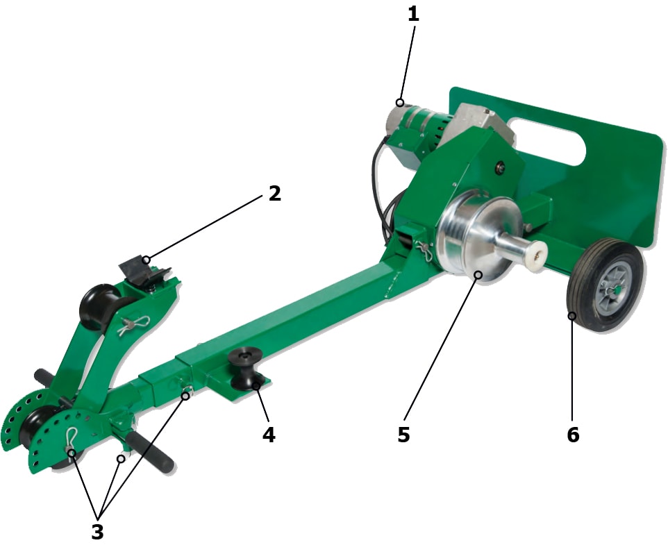 4. SAFE Right angle sheave keeps operators safely out of direct line of pulls 5. QUICK Dual capstan pulls: - High Speed (97 ft/min)+ - Low Speed (41 ft/min)+ 6. PORTABLE Handle and wheels increase mobility around jobsites