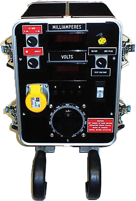 The successful development of Cap Check I for line-type capacitor checking led to the design of the Cap Check II for checking substation capacitors. Cap Check II (either the console or carrying case type) is based on the same principle of operation. A two-man crew can check approximately 500 substation capacitors per day. Cap Check II Console Version (Cat. No. CC-II/102 - right) offers an all-steel, three-drawer cabinet with an attached two-wheel dolly. The unit comes standard with a digital voltmeter and milliammeter, variac control, circuit breakers, all necessary cordage, current probe, and modified hot stick. Cap Check II Carrying Case Version (Cat. No. CC-II/100 - below) provides the same features and options as the console version. It is housed in an aluminum carrying case. Note: Most inverters and generators will not provide a suitable power supply - consult factory Both versions of the Cap Check II include four sets of cordage. All are 50 feet long (15 meters). Current transformer mounts on a 24-foot long (7.2 meter) sectional hot stick modified for application around capacitor bushing (Included but not illustrated).
