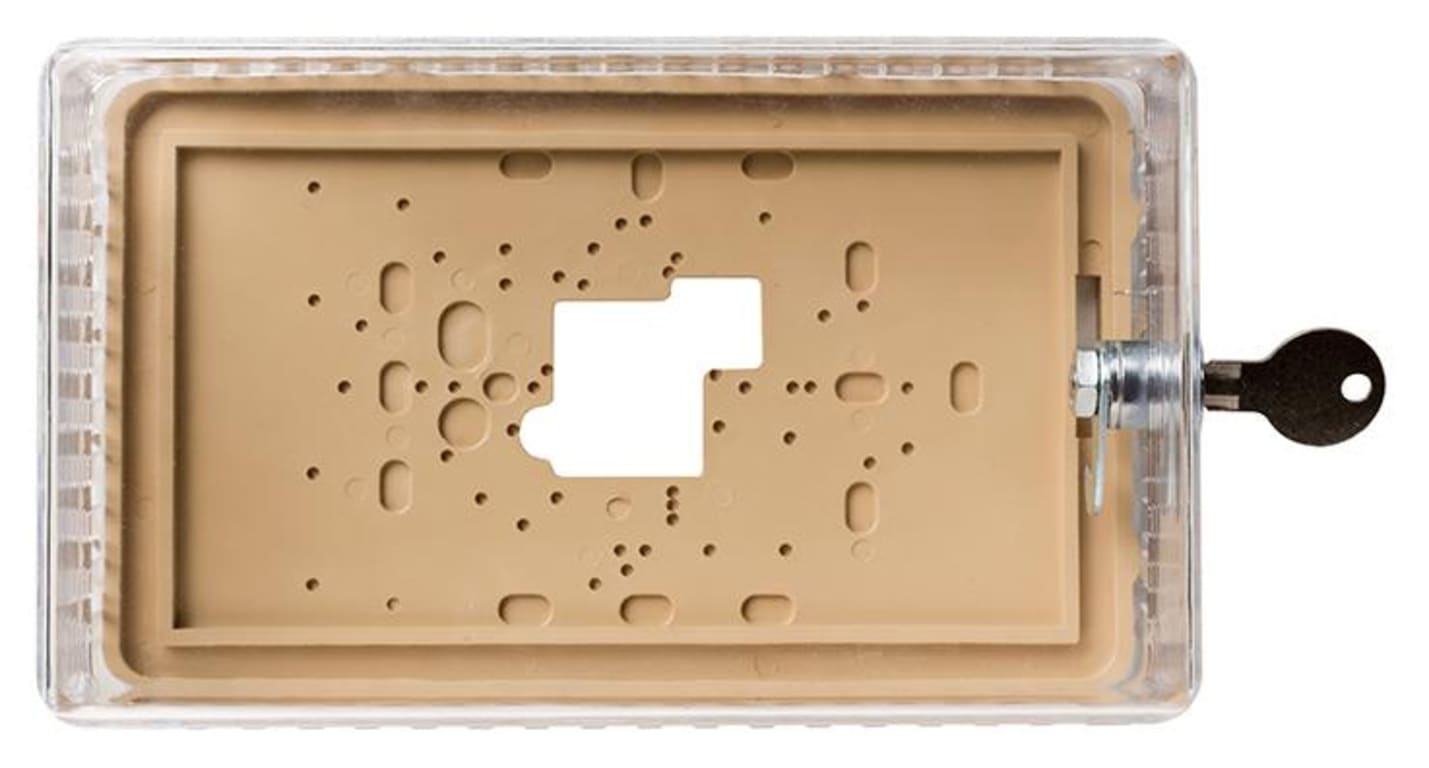 The lockable, vented security case provides complete enclosure protection for HOBO data loggers. It has air circulating ports on all four sides to ensure ample air circulation for proper data logger operation. Each guard has a permanently-attached, eight-tumbler type lock, and each kit is supplied with a key. Guard kits are available with two mounting base types: solid or ring. When using the ring base models, the guard can be mounted to the wall without removing the data logger.