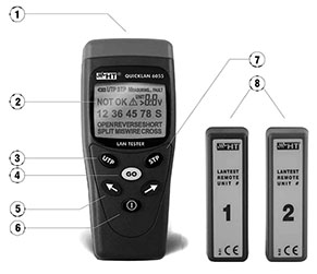 QUICKLAN 6055 permits to perform quickly wire mapping test of LAN networks RJ45 twisted pair cables in compliance to EIA/TIA 568A/B. The meter check all eventual wrong connections (crossed, split, inverted couples, etc..), can detect problems of the cable itself (open circuits, short circuits) and shows results in a large custom display in very simple way. By using up to 8 numbered remote control units it’s also possible to detect the connection between the RJ45 sockets located in the working rooms and the ones located on the transposition panel or on the HUB. QUICKLAN 6055 is ideal for all installers who need an easy instrument for a preliminary LAN test.