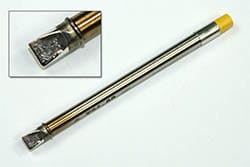 This tip is used with the Hakko FX-100 Induction Heat Soldering System. The T31-03 series use a highly precise manufacturing process that allows for more repeatable tip temperature between not only the same tip shape but also between tips of different shapes within the same series. Tip construction provides similar durability to that of the Hakko T15 Series tips, thus allowing you to experience Hakko's renowned tip life. The new high-frequency induction heaters are precisely tuned and highly responsive with excellent power output. This type has a shape like a cone or column cut at a slant, which allows users to select the cut surface size depending on the workpiece. It is used for drag soldering and pre-tinning of lead wires.