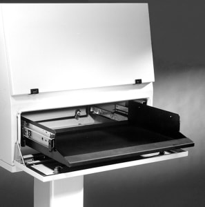 The Hammond 2CWDSR Terminal Keyboard Shelf is designed specifically for use in Data Terminal. It has a sloped wrist rest that provides comfort for the operator. It locks in place when extended. Its 20" width accommodates standard width keyboards. It is finished in textured black. Slides and slide-out mouse pad (left or right) are included.